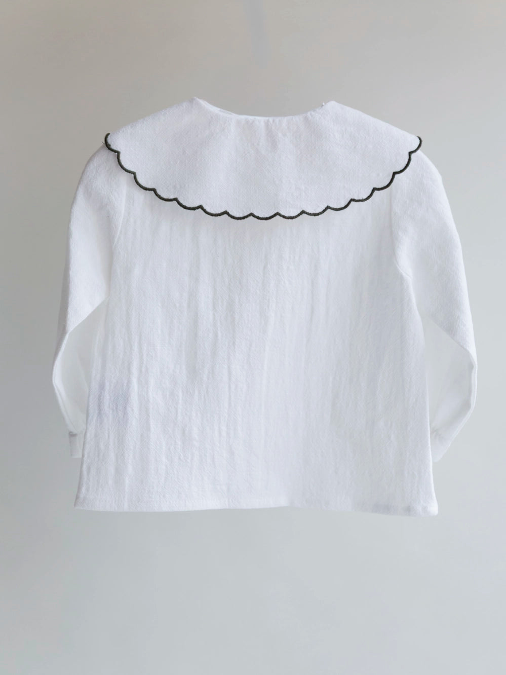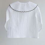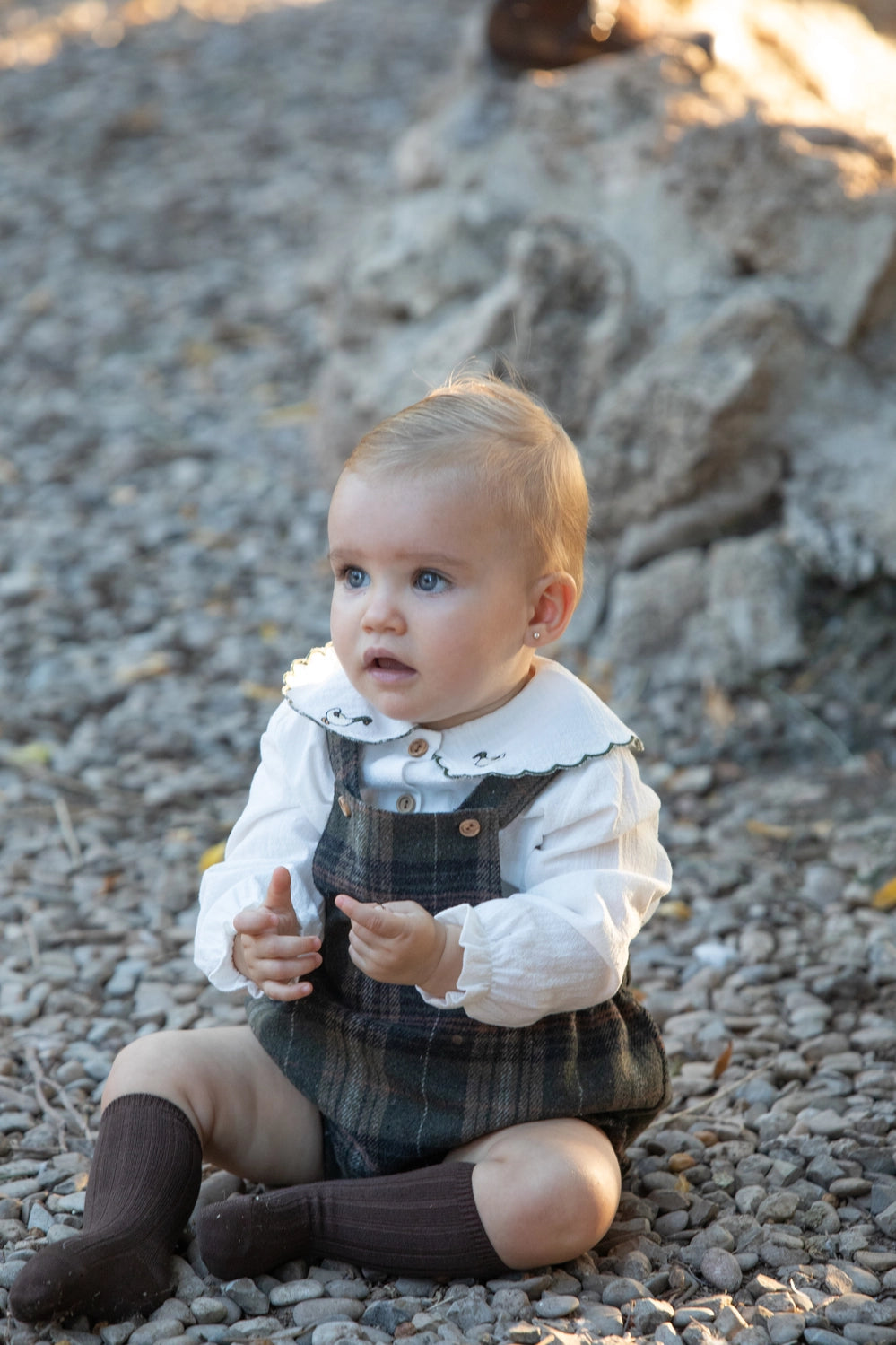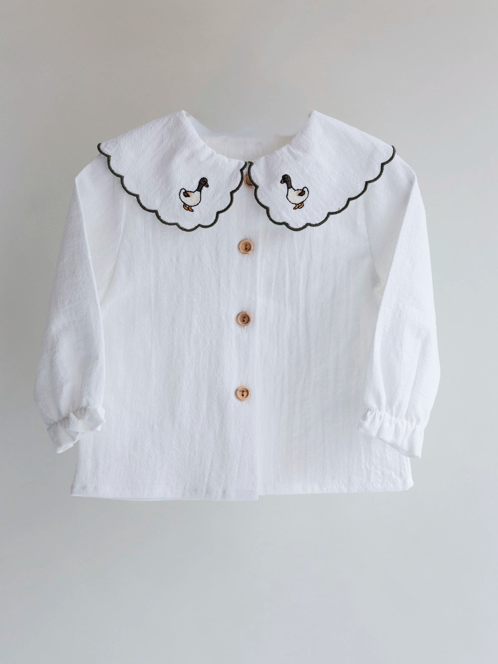 Blusa para bebé confeccionada con algodón 100% de alta calidad, ideal para cuidar la piel delicada de los más pequeños. Textura suave, ligera y transpirable que garantiza comodidad durante todo el día, mientras que su diseño dulce y versátil la convierte en una prenda perfecta para cualquier ocasión. Color blanco roto con cuello acabado en onditas y con dos patitos bordados en el cuello para combinar con nuestras prendas de la colección.