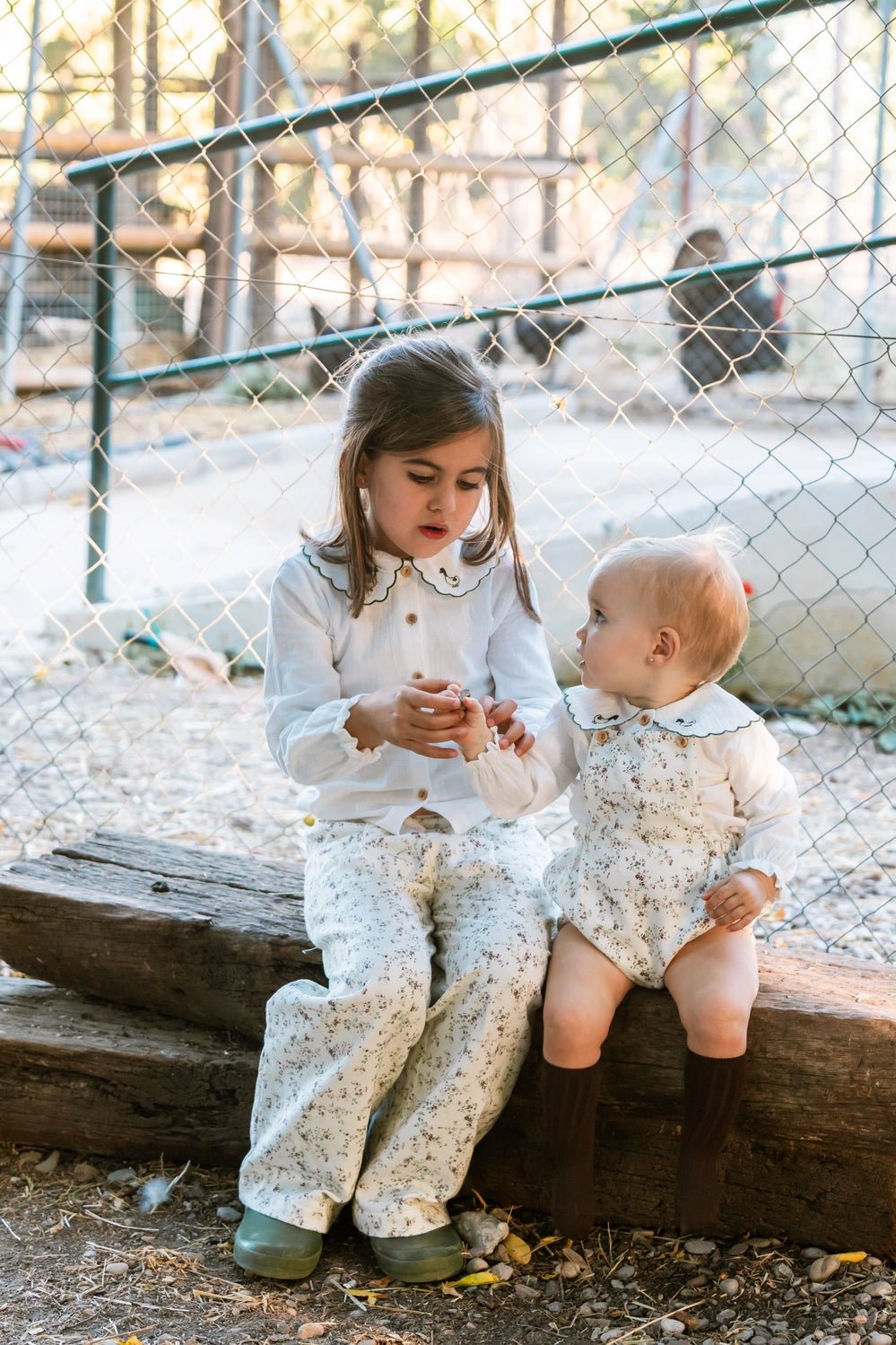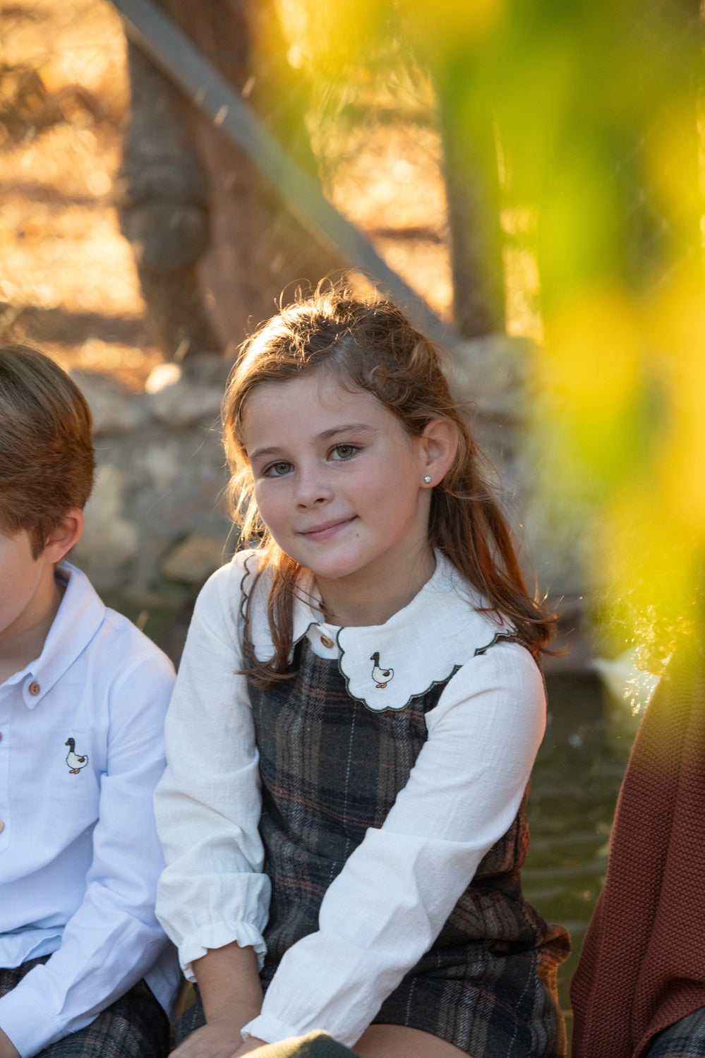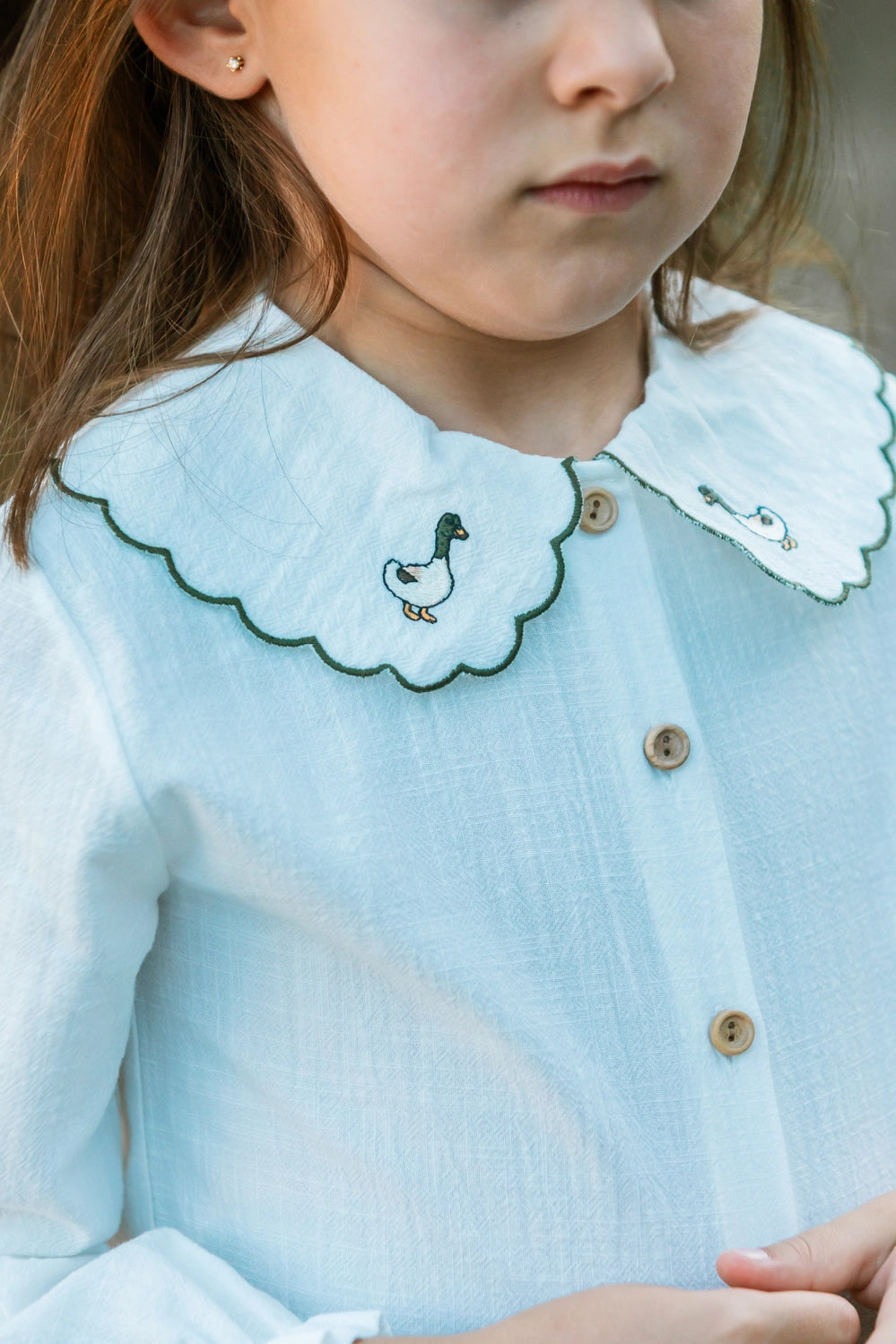 Blusa para niña confeccionada con algodón 100% de alta calidad, ideal para cuidar la piel delicada de los más pequeños. Textura suave, ligera y transpirable que garantiza comodidad durante todo el día, mientras que su diseño dulce y versátil la convierte en una prenda perfecta para cualquier ocasión. Color blanco roto con cuello acabado en onditas y con dos patitos bordados en el cuello para combinar con nuestras prendas de la colección.