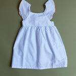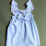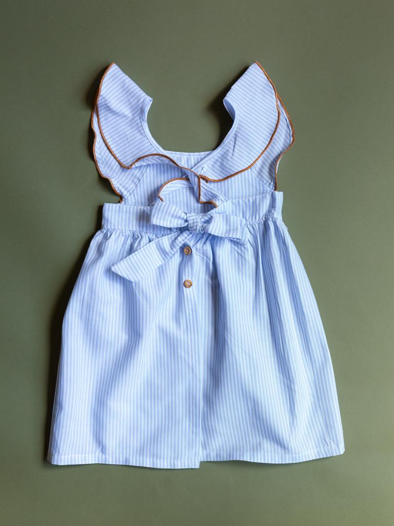 Vestido en rayitas azules con vivo mostaza y volante para niñas de 4 a 12 años. Es perfecto para primavera y verano ya que es fresco y con una chaqueta de algodón por si refresca es suficiente.